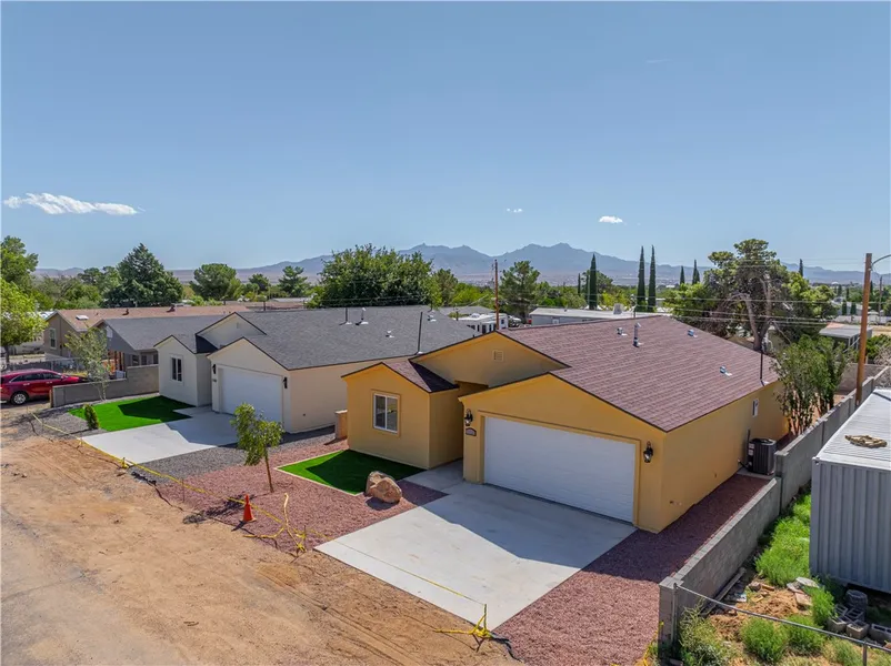 Desert villa warm-toned style NEW BUILD with thoughtful upgrades bring a modern touch to this 1,212 sq ft home. This home is designed for comfortable desert living. The kitchen features granite/stone countertops, an inviting center island, stainless steel appliances, and upgraded light fixtures. Walk-in showers with handicap-accessible design add ease, while the low-maintenance front and back landscaping keep upkeep simple. A full block-wall fence surrounds the property for added privacy. This property is ready for you to bring the outdoor backyard furniture! This home is a need of its first owner, ready for you! Conveniently located near main roads, the community college, medical services, and shopping, this home blends modern style with everyday practicality.