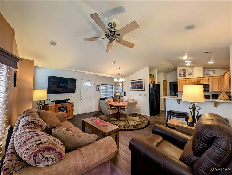 This is a beautiful rare 16 foot wide park model. Feels just like a home with plenty of room. Large open kitchen with full sized appliances. Large bathroom with ample storage and a walk in shower. Bedroom has a king sized bed and a walk in closet. Large dining room that opens into the living room. This home comes furnished with the exception of the dining set and the bar stools. (other furnishings TBD). Nice shed/workshop. This home has been meticulously maintained. All new water lines from the RO to the ice maker have just been installed along with the filters. Home is turn key and would make a great full time residence or a snow bird retreat which is how it is currently being used. This home is located in the desirable Riverview Resort located just minutes from the Colorado River and Laughlin Nevada. The resort in gated and manned 24/7. You own the land and the HOA's are 325.00 per month and include water, sewer, trash and cable TV. Amenities include a top rated executive Golf Course, pickleball, tennis, billiards, indoor shuffleboard, card room, craft room, fully equipped gym with saunas and showers, library, 2 heated pools, 2 hot tubs, a large ballroom that hosts dinners and dances with live bands and so much more. There is so much to do, you will never be bored. Truly an adult playground. Come have fun in the sun. *55+ community *Pet restrictions apply