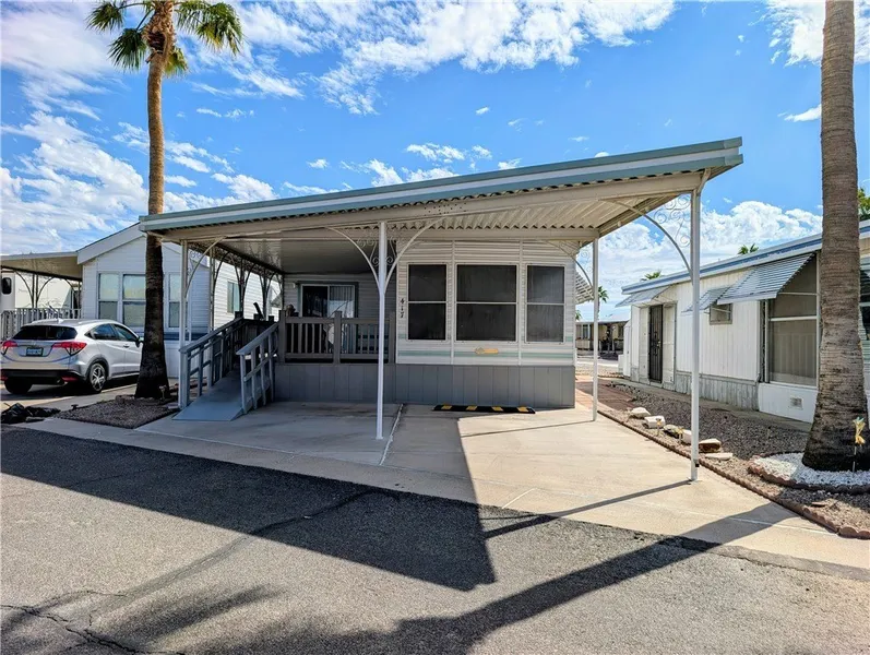 This home is immaculate. Well maintained. Fabulous front deck for entertaining. Laminate plank flooring. Rare 2 Bedroom 1 1/2 Bath with a large walk-in closet. New compressor in the heat pump and a new hot water heater takes the worry out of home ownership. Large shed with electricity for all of your storage needs. Covered parking for 2+. Wheelchair ramp. This is a must see located in Riverview Resort just minutes from the Colorado River and Laughlin Nevada. This is a gated 55+ community. The amenities include a top-rated par 3 golf course, pickleball, tennis, 2 pools, 2 hot tubs, fully equipped gym with saunas and showers, Card room, billiard room, craft room, indoor shuffleboard, library and a ballroom that hosts dinners, dances, bingo and more. This is truly an adult playground. There are many groups to join like, Desert Riders off roaders, Bowling, Golf, Texas Holdem and so much more...
