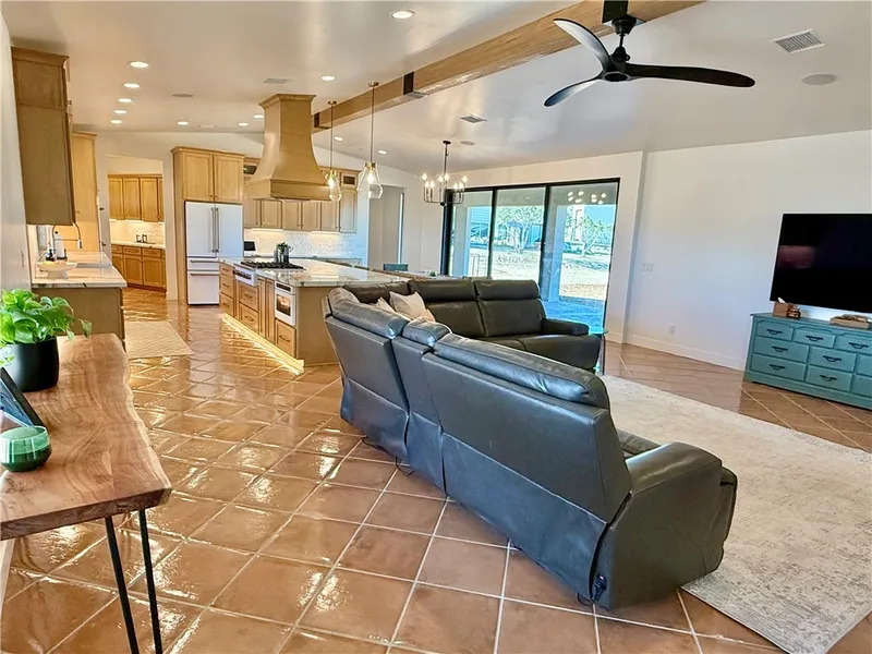 Experience unparalleled desert luxury in the prestigious Canyon Ranch Properties of Kingman, Arizona. Set on more than six acres of private, fenced grounds enveloped in mature juniper and natural desert landscape, this estate offers commanding mountain views, and a level of craftsmanship rarely found. Encompassing over 2,560 sq ft of refined living space, this residence was stripped to the framework and newly constructed to reflect the quality, efficiency, and aesthetic of true luxury new-build living. No detail was overlooked and no surface untouched. Every major element from metal roofing and black-trim windows to interior walls, doors, insulation, and dual HVAC systems has been replaced with premium materials and forward-thinking design. An on-demand recirculating water system ensures instant hot water throughout the home, while rain gutters, energy upgrades, and modern infrastructure underscore the property s long-term value and integrity. The gourmet kitchen has an all-white Cafe appliance suite with champagne bronze fixtures making a sophisticated design statement, an apron-front farmhouse sink and built-in microwave drawer, 36-inch gas cooktop, double electric smart wall ovens, and dual smart dishwashers. . The expansive walk-in pantry doubles as a luxe coffee and prep bar with custom cabinetry, abundant workspace, and an integrated two-drawer freezer. Every finish inside the home was hand-selected for elevated elegance. Bedrosians glazed porcelain tile grounds the living areas in warm, timeless terracotta tones, while the bedrooms feature rich white oak Lifeproof engineered hardwood flooring. Ivy Hill terracotta tile completes the bathrooms, all having custom tiled walk in showers. All new black interior doors and windows add modern architechtural drama and contrast! A tri-panel glass slider opens to the outdoors, allowing dining and living spaces to flow. Extensive outdoor living spaces include full-length covered patios that span both the front and back of the home. The oversized, finished four-car garage showcases new epoxy flooring and modern wood-look doors, and a metal RV covered parking spot out back. Additional features include professional surround-sound wiring, RV metal-covered parking, a dedicated fenced area for animals, private well, septic system, and more! YOU CANNOT DUPLICATE THIS BEAUTY!