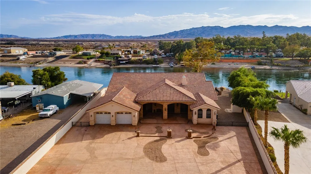 The thoughtfully designed split floor plan layout features a Retreat to the luxurious primary suite, which offers a lavish main bathroom with an oversized double shower, a separate toilet and bidet room, and a two-person jetted tub overlooking the river, generous counter space, and an expansive jaw dropping walk-in closet provides abundant space for all your wardrobe needs! On the other side of this spacious home lays 3 bedrooms, two of which share a jack and Jill bathroom and the other is perfect for a spacious office, gym, or playroom, and don't forget the second en-suite off the living room featuring its own river views and separate bathroom. The heart of the home is a chef s dream kitchen, complete with a glass cooktop, over sized sink, stainless steel double oven, prep sink, two microwaves, spacious pantry, and a Sub-Zero fridge and freezer. The open-concept living area is ideal for hosting gatherings, with ample space and a cozy fireplace adding to the inviting ambiance. The formal dining room is perfect for grand feasts and special occasions. Not to forget the in home roomy laundry room leading to the attached 2 car garage. Additional amenities include a 10-car detached garage with all the space for the toys, RV hook ups, and an attached studio with a full bathroom and stand-up shower. This versatile space can serve as a guest suite, office, or creative area. Enjoy riverfront living with two Private boat ramps, your own floating dock, and a sandy beach at your fingertips. The backyard is perfect for entertaining, with plenty of space for outdoor fun. This exceptional home offers endless possibilities, whether you envision it as a primary residence, vacation retreat, or income producing vacation rental. With its luxurious amenities and prime riverfront location, it truly has everything you could ask for and more. Minutes away from Needles Marina, Jack Smith Marina, Pirates Cove Bar/Restraint/Resort, and Topock66 Marina/Restaurant. Call your personal REALTOR today to explore this remarkable home and make it yours!