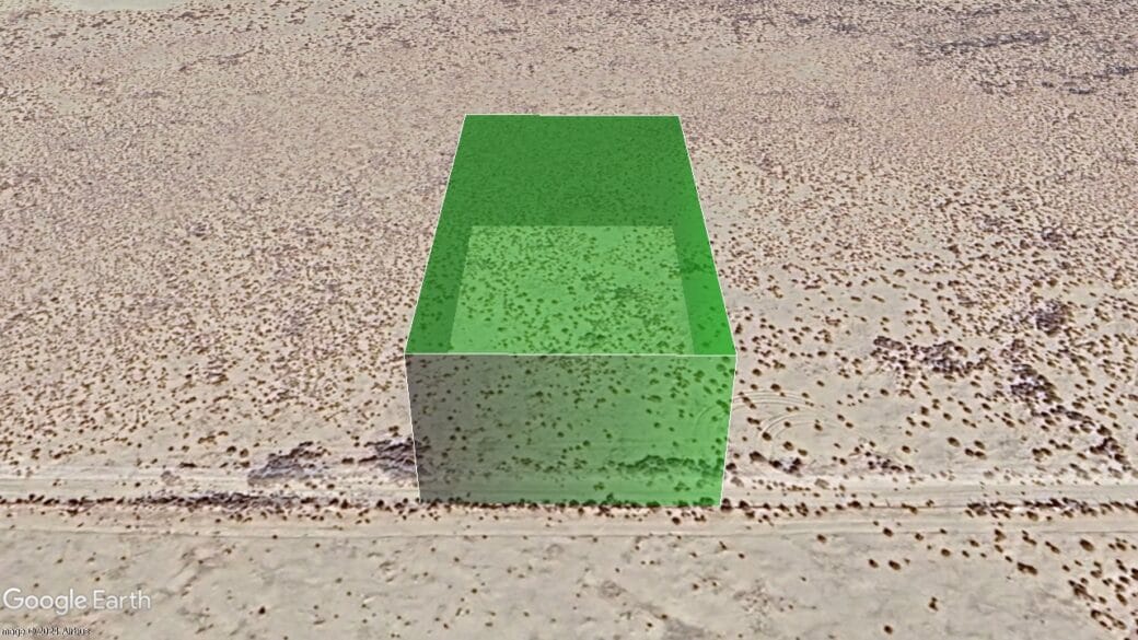 Coordinates: NW corner: 35.5614, -113.9311 NE corner: 35.5614, -113.9307 SW corner: 35.5606, -113.9311 (ROAD) SE corner: 35.5606, -113.9307 (ROAD)