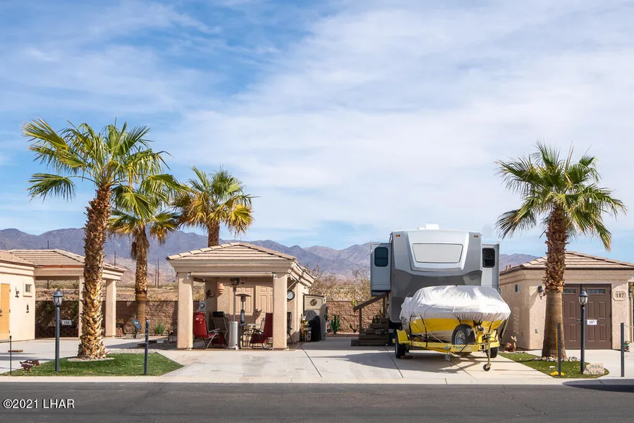 One on the larger lots in Lake Havasu City's fabulous 5 Star ownership resort! This very clean and well maintained Resort features 2 clubhouses, 2 pools, 2 hot tubs, fitness center, putt putt golf, horseshoes, bocce ball, and much much more! Desirable east wall perimeter lot with a casita, ramada and gorgeous landscaping! Inside the casita you will find plenty of built in cabinetry, tile floors, 1/2 bath, sink, refrigerator, water softener, and double doors for easy storage of larger items. A high efficiency LG A/C and heater will help keep it comfortable inside! The ramada is a great place to relax and is finished very nicely with tile floors, and sun/wind shades for comfort! You will love the gorgeous views in front and back on this lot! Must see! Accommodates all qualifying RV types.