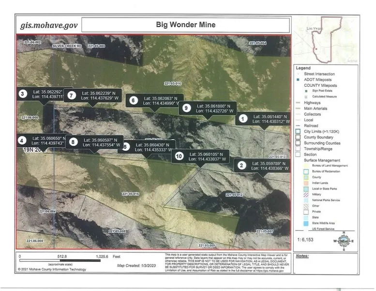 This is a patented mining claim called Baldwin/Big Wonder AKA The Wonder Group. It contains 11 claims. There is a 390' shaft and 600' feet of drift per Weeds, The Mine Handbook 1922. The mine was originally operated by the Jerome-Oatman Mining Co. from 1915-1917. It is located just south/southwest of Silver Creek Road. Latitude: N 35 Deg 03 Min 30 sec. Longitude W 114Deg 25 Min 43 Sec. Commodity: Gold Lode and Silver. Owner/Agent. No legal access or road to property. Must hike to it. Longitude and Latitude plotting is approximate and obtained from Mohave County GIS Mapping Public System. You may go to Mohave county government website and access the same mapping system. Good apps to use are onXHunt, Land Glide, and others that may be downloaded to your mobile phone. No utilities to property. One of the sellers is a licensed R. E. Agent in Arizona. Sellers will look at offers and consider a 1031 exchange or trade.