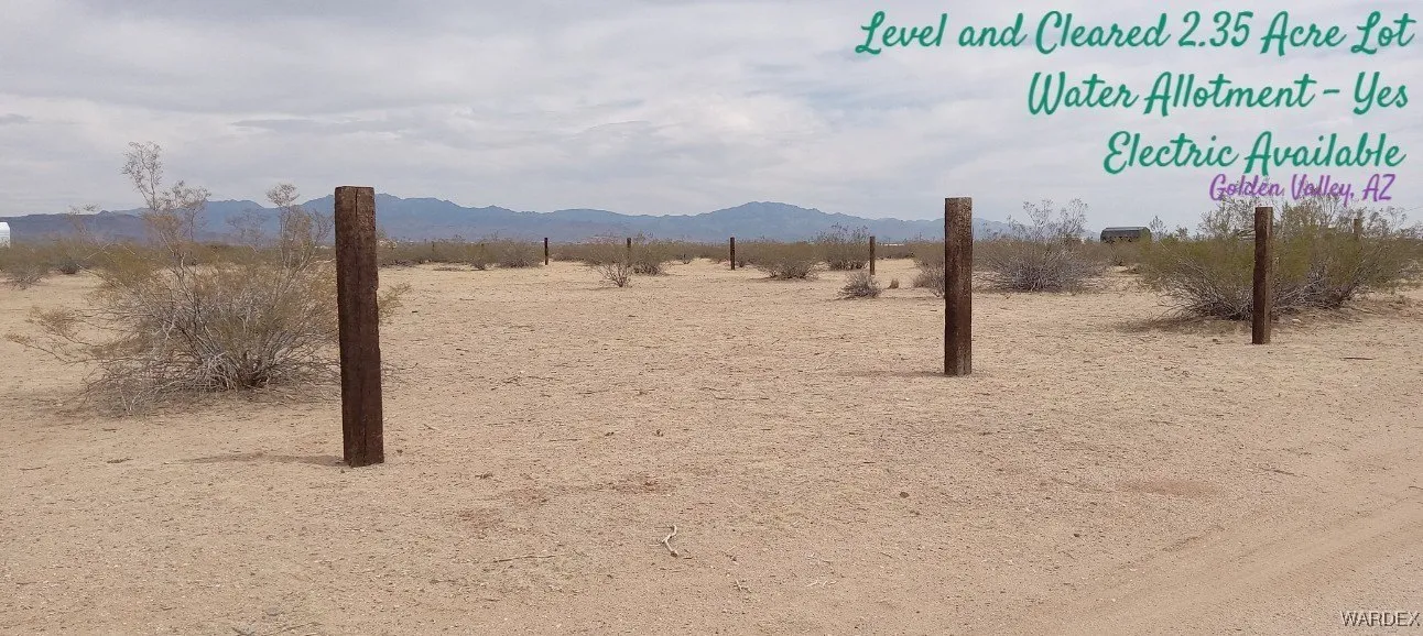 Easy access, quiet and private, 2.35-acre lot in Golden Valley with a water allotment and electric available at the lot line. Fence posts installed with cement, zoned agriculture/residential so bring the animals and build your dream desert home. The possibilities are limitless. Drive by the lot and contact your real estate agent for all the details.