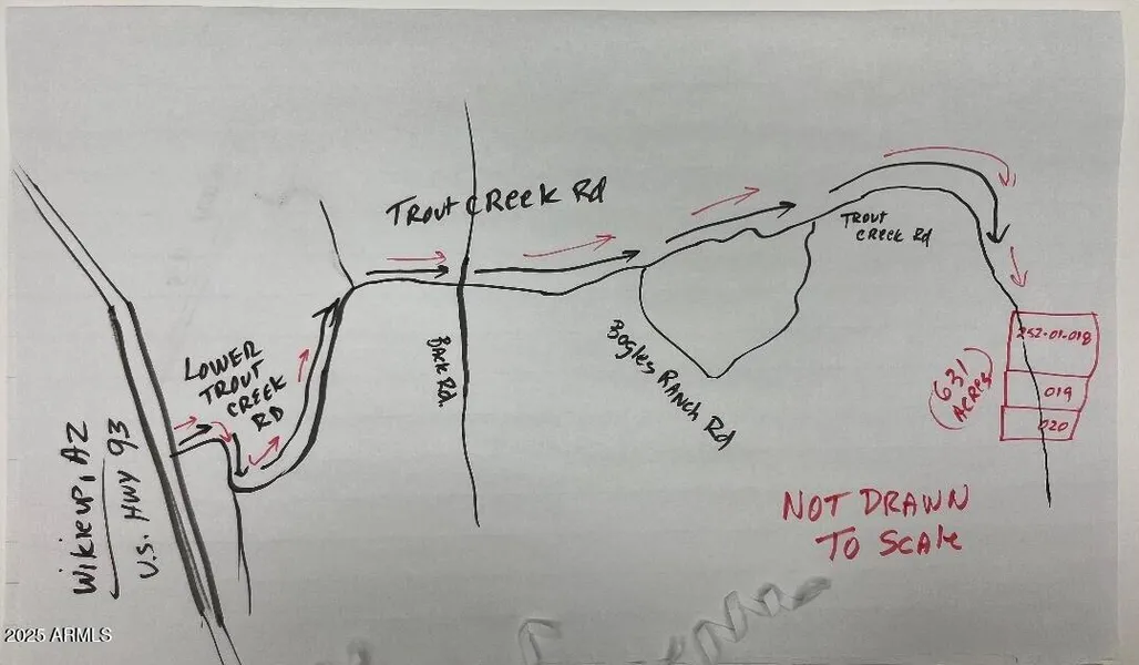 631 Acres of beautiful mountains, valleys, flat land.... everything you would ever want in a secluded ranch away from it all but only minutes from the town of Wikieup and about one hour from Kingman! Plenty of State and Federal Trust land all around so bring your toys! Seller says depth for drilling a well is only about 250 feet! Trout Creek Road runs through all three parcels. See map pictures in the photos. Map starts at Lower Trout Creek Road entrance north of Wikieup, that is between Mile Marker 110 and 111. GPS Coordinates: 252-01-019: Latitude 34.8971242038619 Longitude -113.485372525131........252-01-020: Latitude 34.8934551623909 Longitude -113.485327012347........252-01-018: Latitude 34.9025463222907 Longitude -113.485282666322