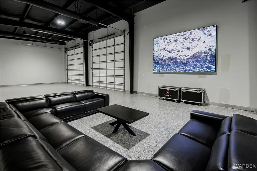 Welcome to the MEGA MAN CAVE! One of the only commercially zoned available properties with a turn lane in the Fort Mohave area. Extensive curb appeal is immediately noticed. 18' Phoenix Dactylifera lining the entrance. 24x6 modernized rolling gate with a keypad entrance. 2 - 12'2 X 14'1 Black, Insulated, Commercial Ribbed Doors. 6' high block wall around the entire half acre. Pitched metal roof, for a continuation of the modern design. Completed with landscaping throughout. The interior of the mega mancave is a total wow factor. Epoxy flooring throughout with additional glitter coating. LED bar mirroring the entrance gate design, including a refrigerator, freezer, double basin sink, and stainless-steel countertops. The Mancave is fully Automated with a Crestron Automation System. It includes Sonos music distributed audio throughout the entire Man Cave. The Theater area is also equipped ...