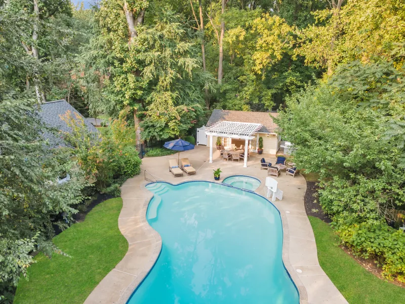 Spectacular 1.23 acre property situated on a cul-de-sac in the Reservoir Section of Lincroft! This classic sprawling 4 bedroom Ranch is nestled on a park-like property surrounded by mature trees and flowering landscaping. Enter the fenced-in pool side yard for a resort-like experience made for entertaining. The charming pool house features an updated kitchen with bar peninsula, full refrigerator, beverage refrigerator, and an enclosed hot water outdoor shower. Beneath the sun shade pergola the french doors open to a 50 ft. freeform in-ground gunite heated pool and attached large spa. Inside the home find a wide formal foyer, thoughtfully crafted millwork, pocket doors, hardwood floors, and a tastefully mantled gas fireplace. This home offers a larger master bedroom with a walk-in closet and an updated en-suite marble full bathroom, plus 3 additional bedrooms, and a second updated Carrara...