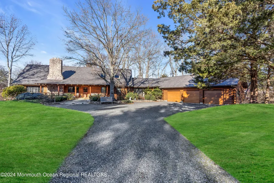 3.4 Acre ESTATE with Custom-built Log Home and SHORE RETREAT. 5-minute drive to the BEACH. Gunite HEATED SALTWATER LAP POOL with custom flagstone patio, Long Winding Private Driveway leading to your own Nature Reserve and Romantic SUNRISE front porch. 28-Foot SOARING Ceiling GREAT ROOM warmed by a RIVER ROCK Fireplace. OPEN FLOOR PLAN provides tons of natural light in this 3000 sq ft 5 BD / 3 BA EXPANDED RANCH, plus FULL 10-Foot Ceiling Basement. Perfect Layout with 2 Primary En-Suites: Main Level with Private Patio; Second Level with balcony overlooking the lush property. You deserve this LIFESTYLE!