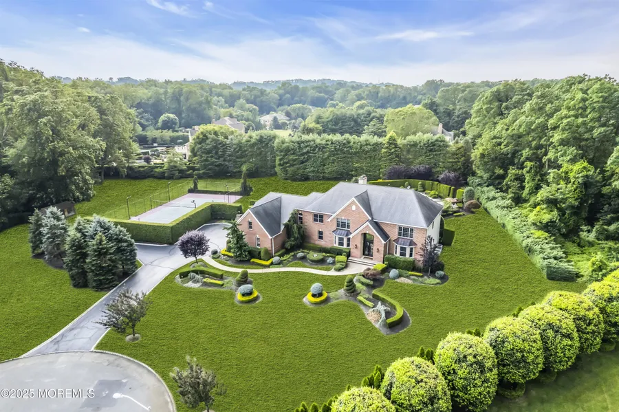 Welcome to one of Holmdel Townships most iconic developments ''The Gables'' and this custom beauty is an absolute stunner. This lot is bar none one of the finest pieces of properties in all of Monmouth County situated on over 3 acres of flat and useable end of cul-de-sac majestic territory surrounded by lush mature landscape and privacy. Custom built home featuring 6 bedrooms 5.5 bathrooms sprawled across three floors and over 10,000 sq ft of finished living space including the finished basement. Soaring ceiling heights and a gorgeous open floor plan with absolutely nothing to do but move in and unpack. Hwd floors throughout with super clean and updated baths along with tons of ample storage and great closet space. Oversized chefs kitchen with all high end appliances and walnut cabinetry with a private breakfast nook area over looking the serene and finished resort style yard. Outdoors have a remarkable oasis with massive pool and a huge paver patio entertaining area followed by a fully built out sports court with night lighting! These types of parcels do not come around often and located close to all major transportation and shopping along with one of the top school districts in the state this is an absolute no brainer. Come and see it today!