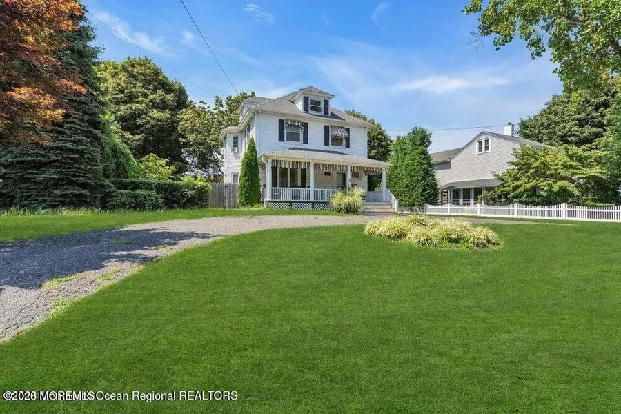Beautiful Shore Colonial featuring a circular driveway and inviting rocking-chair front porch. The home offers a large entry foyer, spacious and sun-filled living room, and formal dining room highlighted by gorgeous original woodwork and oak pocket doors. Hardwood oak floors throughout, detailed oak banister, and decorative moldings add timeless character. The first floor includes an inviting kitchen with breakfast bar, full bath, and laundry area. The second level features a primary bedroom with walk-in closet, two additional bedrooms, and a full bath. A full attic provides flexible space for a bonus room, office, or playroom. Full basement designed for recreation. Expansive fenced backyard with above-ground pool. Conveniently located near Monmouth University, beaches, Pier Village.