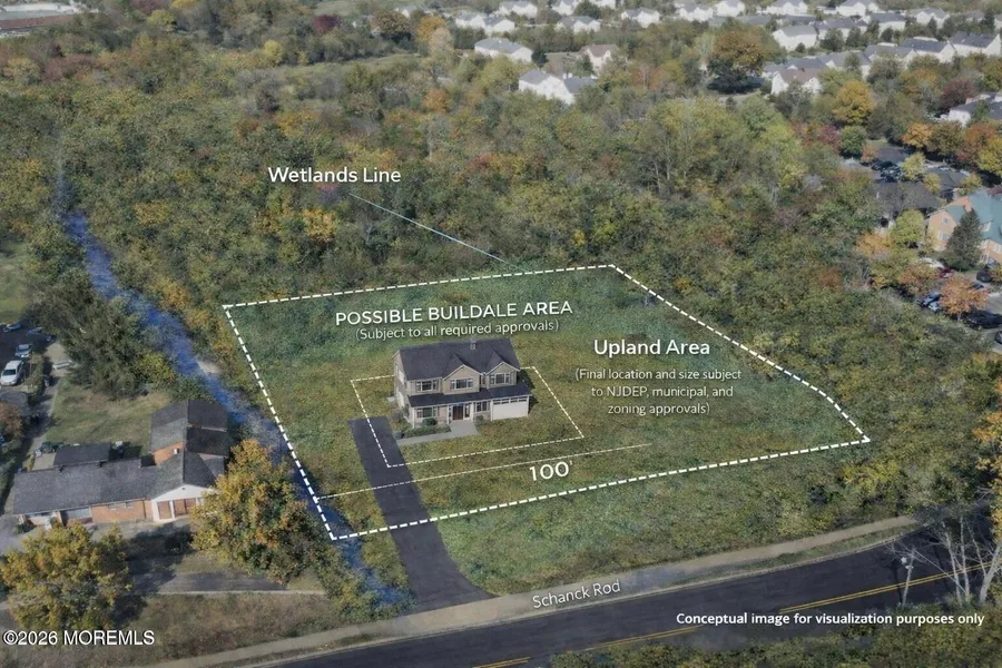An excellent opportunity to build a custom home on a private, wooded lot in desirable Freehold Township. Conveniently located near Route 9, the property offers easy access to shopping, dining, major highways, schools, parks, and local amenities. Public utilities, including water, sewer, gas, and electric, are available at the street, supporting a streamlined development process. Based on the seller's understanding, the property is suitable for a residence of approximately 1,468 square feet as currently configured. Due to the presence of a stream on the property, required flood-related permits will apply. A variance would be required for construction of a larger residence. Prior planning documentation indicates that a home of up to approximately 2,900 square feet was previously contemplated, subject to municipal approvals, environmental regulations, and all applicable permits. The lot includes delineated wetlands and a scenic stream, offering natural character while requiring additional planning and regulatory review. Buyers are encouraged to perform their own due diligence. Please review the drone video tour for a comprehensive overview of the property and site conditions.