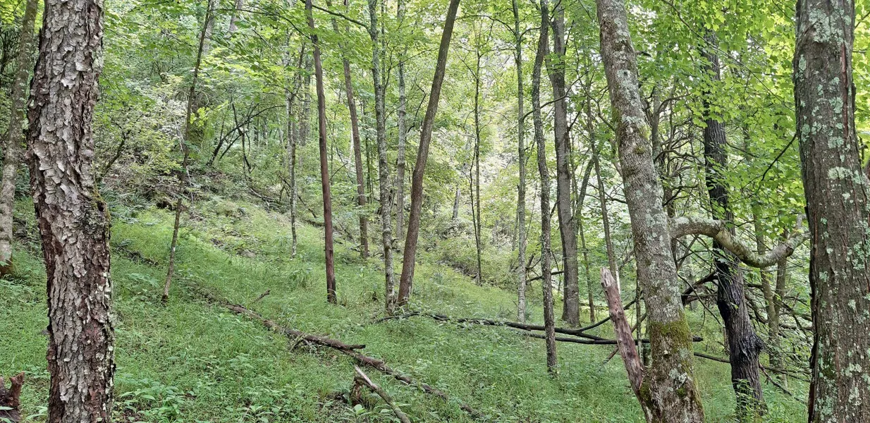 About 90% of the land is wooded. The woods are mainly red oak, tulip poplar, hickory and some white oak. This property has not been timbered recently, but there is probably not much marketable timber on it now. The timber rights DO go with the property, which is not always the case in West Virginia. The property is mainly sloping to hilly, but there are a couple of nice flats on the property that would make a nice cabin site or possible building site.
