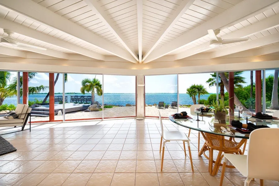Frank Lloyd Wright inspired mid-century modern. Oceanfront Cudjoe Gardens mini estate. Architecturally unique and exciting 3 Bedroom 3 Bath 2,479 sq. ft. home. Expansive ocean views throughout. From the moment you enter this masterpiece of a home, your eyes are immediately drawn to a forty-foot wall of floor to ceiling sliding glass doors that open completely, allowing ocean breezes to flow through the home all year long for the ultimate indoor/outdoor living experience. Stunning, cathedral beam ceilings and tile flooring throughout. One Bedroom, one Bath sound proofed, attached guest quarters with vast possibilities as a Mother-in-Law suite, or private office/studio. The oceanfront backyard is perfectly designed for entertaining or lounging by the sea with a waterfront deck, mini beach, and outdoor shower. Set on a private, sprawling 14,460 sq. ft. lot with mature landscape including ma...