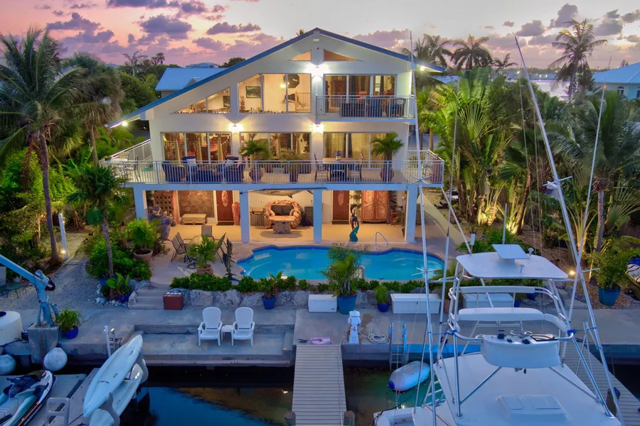 Spectacular Angler's Paradise with unmatched boating amenities & Ocean access in exclusive Coco Plum! With 110' concrete dock, complete with two 40' finger piers w/mooring pilings capable of docking three 50+ ft. yachts, davits, two floating jetski docks, floating kayak dock, fillet station, swim ladder, step down, dock boxes and paddleboard stand, this property is expertly-outfitted for the avid boater! Seller has permits in place for a large boat lift and additional elevator lift, effective through 2027. Situated on a pristine canal, over 200' across, this prime location easily accommodates deep-draft vessels. The sprawling 3,224 SF estate offers an airy open concept with soaring ceilings, and additional 1,400 SF 4th bedroom suite on the first level, with potential for a 5th bedroom! The Great Room features a wall of impact sliding glass doors, offering turquoise Canal Views as the focal point of the space. This home caters to indoor/outdoor living with a full-length open balcony, with firepit and multiple seating areas for al fresco dining, or enjoying evening cocktails. Stairs lead down to a sizable pool deck and covered patio, ideal for grilling your fresh catch! Permits in place for a two-story tiki hut with bridge to second floor balcony. The kitchen in the heart of the home provides ample storage and prep space, and large pantry with bar and wine coolers. Two guest bedrooms on the main level, one with en suite and balcony access, provide comfortable accommodation. The third floor primary suite offers privacy from the rest of the house, complete with en suite bathroom, laundry, walk-in closet, and private balcony with Canal Views! A private Guest Suite is located and the 1st level along with laundry and plenty of room to add a 5th Bedroom. Cool off in the salt water pool with heater/chiller, or unwind in the hot tub. Lushly landscaped, this lot feels serene and private. Enjoy ample parking with wrap-around driveway. Located just minutes from town