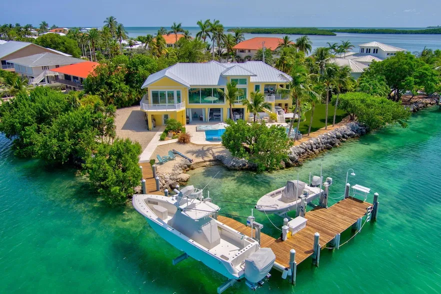 Nestled on a lushly landscaped, gated point lot, this elegant Oceanfront Duck Key Estate epitomizes resort-style seaside living. Offering sprawling dockage with enviable boating, custom 2021 pool, and sandy beach, your ideal Florida Keys lifestyle awaits! Built in 2020, every detail has been considered in this intuitively designed retreat; with expertly curated aesthetics blending relaxed sophistication with the surrounding turquoise waters, beckoning the outdoors in. Upon entry, the massive great room boasts cathedral tongue and groove ceilings and sweeping views of Toms Harbour. Entertain for the masses with a breezy open concept floor plan and an expertly-appointed Chef's Kitchen in the heart of the home. Premium Viking appliances, granite countertops, custom cabinetry, and sprawling island with seating allows for cultivating culinary masterpieces with ease. Wake to endless turquoise ...