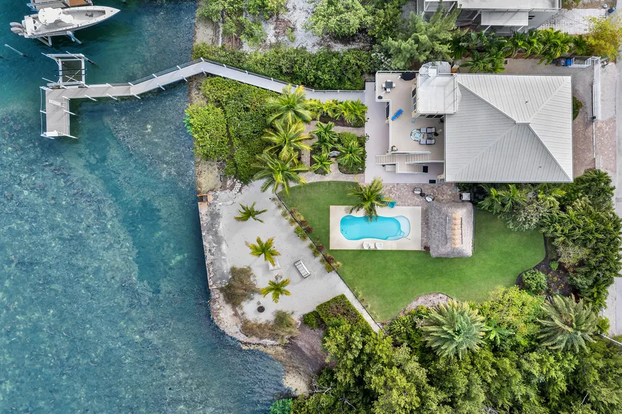 Discover Keys style living within this exquisite gulf front estate, perfectly situated on two expansive open-water lots totaling 16,890 square feet for privacy. Immerse yourself in a tropical paradise featuring meticulously landscaped gardens adorned with lush greenery, rare orchids, mature palms, all professionally designed and fully irrigated. A sandy beach area invites you to launch kayaks and paddleboards. Tasteful landscape and underwater lighting creates a serene, magical ambiance at dusk. This boater's dream property is equipped with a 16,000-lb boat lift, electric, fresh water, a lighted fish-cleaning station, and swim ladder for ultimate convenience. The outdoor Tiki kitchen is perfect for cooking your fresh catch or simply relaxing with a cold beverage. Here, meals are more than just food, they are celebrations of the sea's bounty, shared under the golden sunset of the Florida Keys sky. Enjoy year-round outdoor living with a heated and chilled pool, a newly screened-in dining area, and an enclosed outdoor shower featuring both hot and cold water. Inside, the home offers 3 bedrooms and 2 baths with an inviting open-concept design that showcases vaulted wood ceilings and panoramic water views. The heart of the home is a stunning custom kitchen by Hansen & Bringle of Key West, where no detail has been overlooked. Additional recent upgrades include updated central AC and mini-split units, new Tiki kitchen appliances including grill, sink, and refrigerator. A professional irrigation and lighting system, freshly painted interior and exterior. New screened-in dining area on the lower level. Conveniently close to Picnic Island, Content Keys, American Shoal and Looe Key. This home is perfectly positioned for boating adventures as well as the convenience to grocery stores and amenities. Whether you're entertaining or enjoying some well deserved peaceful solitude, this Little Torch Key estate offers a lifestyle like no other.