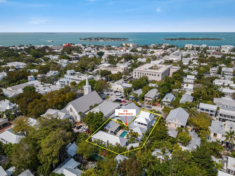 Nestled in the heart of Key West's historic district, 616 Eaton Street is a testament to quality, timeless beauty, and refined living. This single-family residence was constructed in 1911 and painstakingly renovated and reimagined over the last few years culminating in 2024 with the spectacular like new home. Most hidden from the Street, it exudes classic Key West architecture blended with modern elegant designs. With 5 bedrooms, 5 full baths & 2 half baths, the home spans 4,000sf on a large 12,478sf lot. The 2-story primary home contains the living room, dining room, kitchen, 2 office spaces/dens, one of which could be a bedroom if desired, 2 half baths on the living level & a spectacular 2nd floor primary suite with office/ laundry & an enormous outside covered deck for private lounging. Thoughtful renovations include a stunning glass wall that opens between the outdoor dining pavilion & the top of the line kitchen w/ functional pass-through windows from the kitchen to the pool area. Reclaimed hardwood floors & tall ceilings ensure a perfect balance of historical character & contemporary functionality. The substantial living area, accented by natural light, offers a warm & inviting atmosphere & the gorgeous central pool w/ a water feature creates a stunning outdoor oasis & is perfect for entertaining. Surrounding the pool & outdoor dining pavilion are 2 phenomenal guest houses, housing a total of 4BD/4BA plus a full 1,512sf attic w/ staircase that is built for storage. Lots of off-street parking is offered along w/ a carport & small garage. Everything is new, from the hard wood floors & bathrooms to the salt generated heated pool & generator. This property is a rare offering that combines historical significance, luxurious living & an unbeatable location in one of Key West's most coveted neighborhoods. Located in the X flood zone just 2 blocks from both Duval St. & the Historic Seaport, it is walkable to all the wonderful restaurants, galleries & shops.