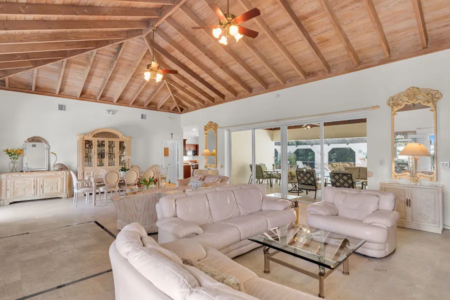 This is a very easy living 3 bedroom, 4 bath home with some wonderful interior architectural features. The main living room ceiling is exceptionally high and features exposed wood and framing beams. This spacious living room is ideal for family gatherings or entertaining. The Living room opens to an additionally large covered patio with a similar high ceiling with exposed woodwork. Outdoor living on the pool patio is ideal on sunny days or cool evenings. The three bedrooms with full baths are complimented by an large den capable of hosting additional guest with its full shower and bath. The office or den area could be easily enclosed as a 4th bedroom option as well. The master bedroom is spacious and has access directly to the patio. It boasts high ceilings and exposed woodwork as well. There are two master closets. One in the large master bath with walk in shower as well as sit tub, and another walk in closet directly in the bedroom. The Kitchen is spacious and opens directly to the outdoor patio and pool deck. Granite counter tops, numerous storage cabinets, dual stoves, and a center island with sink make for a comfortable family kitchen. The garage space provides for a car and cart, as well as additional storage space created by an addition that was built on the side. The home has all the features that allow for comfortable living as a couple, while also being capable of hosting visiting family, raising a family, or entertaining large groups of guests.