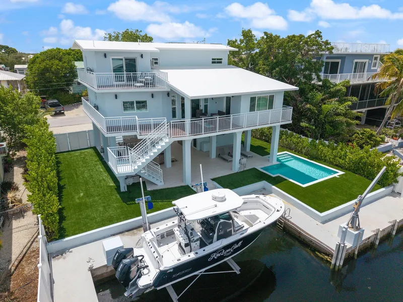 Turnkey Canal Front Pool Home with Ocean Views, Deepwater Dockage & Immediate Ocean Access. Just one canal from the open Atlantic, this 4-bedroom, 3-bath concrete home offers the ultimate Keys retreat. With 72 feet of dockage, a 14,000-lb boat lift, and sweeping ocean views, it's perfectly designed for boaters and entertainers alike. Recently updated inside and out, the home features CBS construction with a concrete roof and impact windows and doors. The interior boasts modern tile flooring throughout, plantation shutters, and a beautifully remodeled kitchen with a large island that flows into the open living and dining areas, highlighted by vaulted ceilings and ocean views. The main level offers two guest bedrooms with a Jack-and-Jill bath, plus a laundry room and ample storage. The spacious primary suite on the third floor includes a private balcony with panoramic ocean views, along wi...