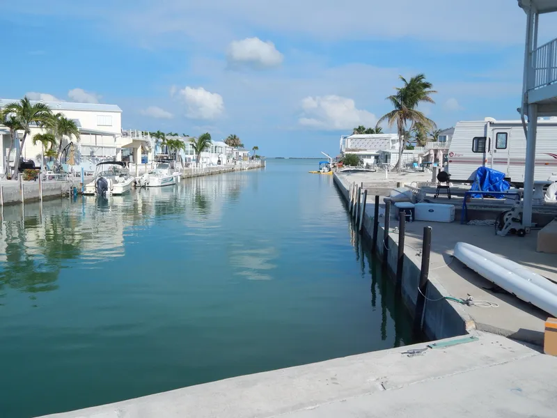 Oversized RV lot with nice open water views down the 60' wide canal with enjoyable tropical breezes. A 17' stepdown concrete seawall with cleats is perfect for your boating needs. Easy access to both the gulf and ocean. Impeccable lot with concrete pad, tropical landscaping, picnic table & electric hookup with 30 & 50 amp. Venture Out has extensive amenities including 80' heated pool, spa, tennis courts, pickleball courts, bocce courts, marina, boat ramp, fuel dock, marina store, gated entry with 24 hour security & many community activities. Weekly rentals are allowed and if so desired a permit for a new modular home would be possible. Great investment! This lot is ROGO exempt so down the road you can always build a modular home.