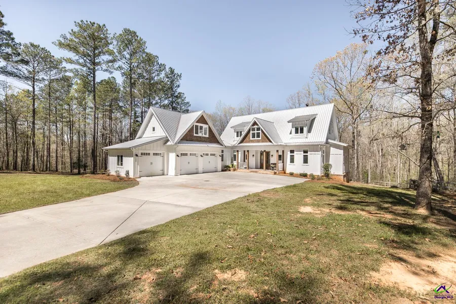 Welcome to your dream farmhouse nestled on 15 wooded acres in the picturesque landscape of Forsyth, GA. This nearly 4600 square foot home exudes charm and elegance, offering a perfect blend of modern luxury and rustic allure. As you enter, you'll be greeted by the warmth of farmhouse-style architecture, where every detail has been meticulously crafted. The main floor boasts a spacious master suite, providing a serene retreat with its own luxurious ensuite bath. Upstairs, discover three additional bedrooms, each accompanied by its own ensuite bath, ensuring comfort and convenience for family and guests alike. The heart of this home lies in its inviting living spaces, including a cozy loft/sitting area upstairs, perfect for unwinding with a good book or enjoying views of the surrounding woodlands. Step outside onto the expansive covered deck, where gatherings with loved ones are elevated to new heights. Whether hosting a barbecue or simply savoring the tranquility of nature, this outdoor oasis offers endless possibilities for entertainment and relaxation. For added convenience, a separate apartment-style bedroom awaits above the attached three-car garage, providing flexibility for extended family, guests, or even a home office. Embrace the freedom of country living while still enjoying modern amenities and comforts. Surrounded by lush greenery and mature trees, this property offers a private sanctuary away from the hustle and bustle of city life. Explore the natural beauty of the expansive 15-acre estate, where opportunities for outdoor recreation abound. Escape to your own slice of paradise and experience the quintessential farmhouse lifestyle in Forsyth, GA.