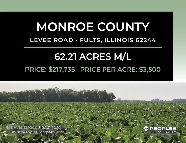 Offering 62.21 acres m/l of tillable and recreational ground along the Mississippi River in Monroe County, IL! Located just 40 miles south of St. Louis, this affordable property offers over 2,000 ft of Mississippi River frontage allowing for endless recreational opportunities. Income is provided by 22.69 FSA tillable acres carrying a productivity index of 112.5. The remaining portion of the farm is comprised of timbered areas, which combined with river access create excellent deer and waterfowl hunting potential. This land is located west of Fults, IL with good access from Levee Road and in section 23 of Precinct 15 Township, Monroe County.