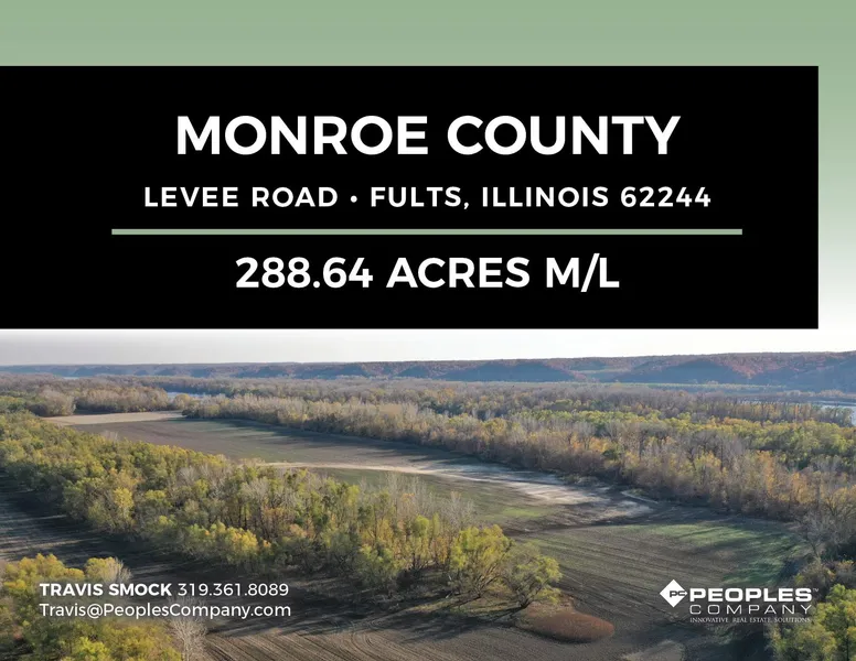 Offering 288.64 acres m/l of unique riverfront farmland near Fults, Illinois. This farm features 107.44 FSA tillable acres carrying a PI of 109 with the remaining land consisting of multiple timbered areas and water. Primary soil types include Haynie silt loam and Blake silty clay loam. The property offers excellent Mississippi River frontage and the opportunity to own part of your own island creating endless recreational opportunities from boating to deer and waterfowl hunting. The farm is located just southwest of Fults with good access from Levee Road in sections 5, 6, 7 & 8 of Precinct 13 Township, Monroe County, IL. Additional land is available in the area.