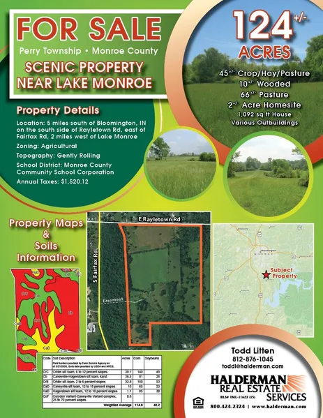 Legal Description: 124 acres, more or less, located in the W 1/2 of S34, T8N, R1W, Perry Township, Monroe County, State of Indiana.