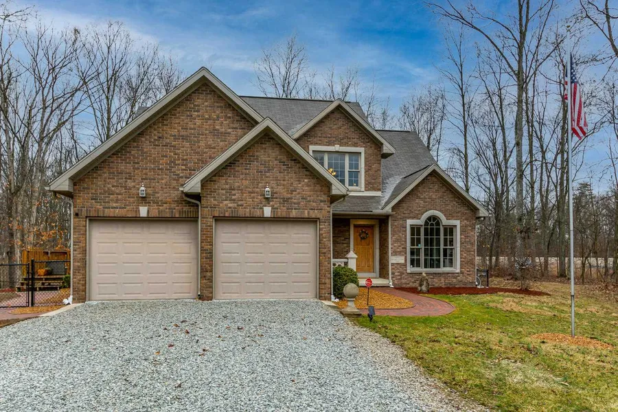 Immaculate and move-in ready sits this well-maintained all brick and limestone two-story home on 9 wooded acres! This beautiful property is one you won't want to miss featuring 4 bedrooms and 3 bathrooms, over a full unfinished walk-out basement! This pristine home offers custom details such as the limestone carved post and railing on the front porch, limestone trimmed windows/doors, and the addition of new red brick pathways. Inside you will find a freshly painted open- concept living space with an upgraded kitchen, featuring new tile backsplash and the large family room with a beautiful gas fireplace. The formal dining room, main level den, and guest bedroom with additional bathroom make for a spacious main level living space. Upstairs offers a large master suite and two additional bedrooms with jack and jill bathroom. The unfinished walk out basement offers plenty of additional storage or finish out space if one desires. The home includes an attached two car garage in addition to the heated outdoor workshop with 220 electric service and air compressor! Outside offers an abundance of nature and plenty of space to roam with extensive walking trails surrounding the beautiful home! Recent updates also include the re-surfaced stone driveway and polished timber flooring! This unique property has an estate feel with an abundance of space and quality features! Come see how this home can meet all your wants and needs!
