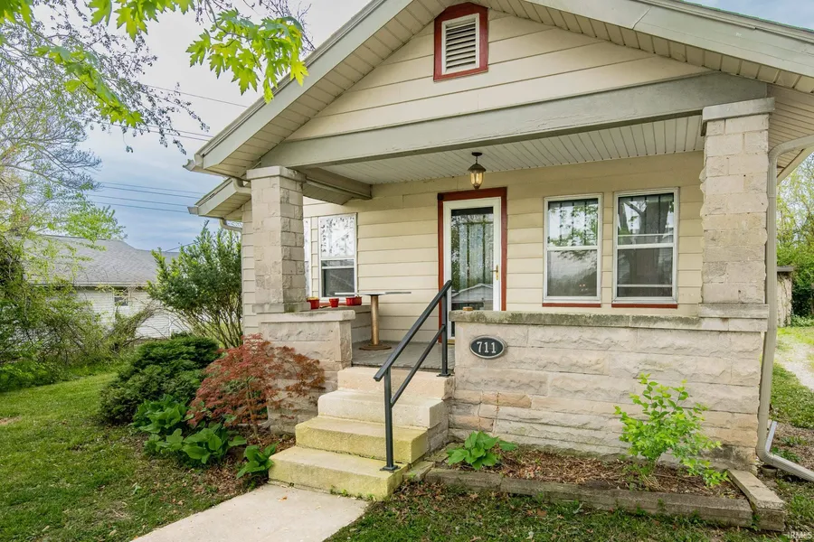 Great price and location for this sweet 2 bedroom 1 bath bungalow on quiet dead-end street just across Rogers from Switchyard Park. Hardwood floors in living and dining room with traditional craftsman colonnade separating the main rooms. Unexpected third common area room with built-in bookshelves would make a great office or den. Two bedrooms and a bathroom sit adjacent the dining room connected by a hallway. Small galley kitchen at the rear of the home opens into basement stairwell which offers abundant extra storage and access to the backyard. Two driveways for off street parking. Convenient close-in Southside location with incredible access to both RCA Park and Switchyard Park, downtown, IU Campus, shopping, and more.