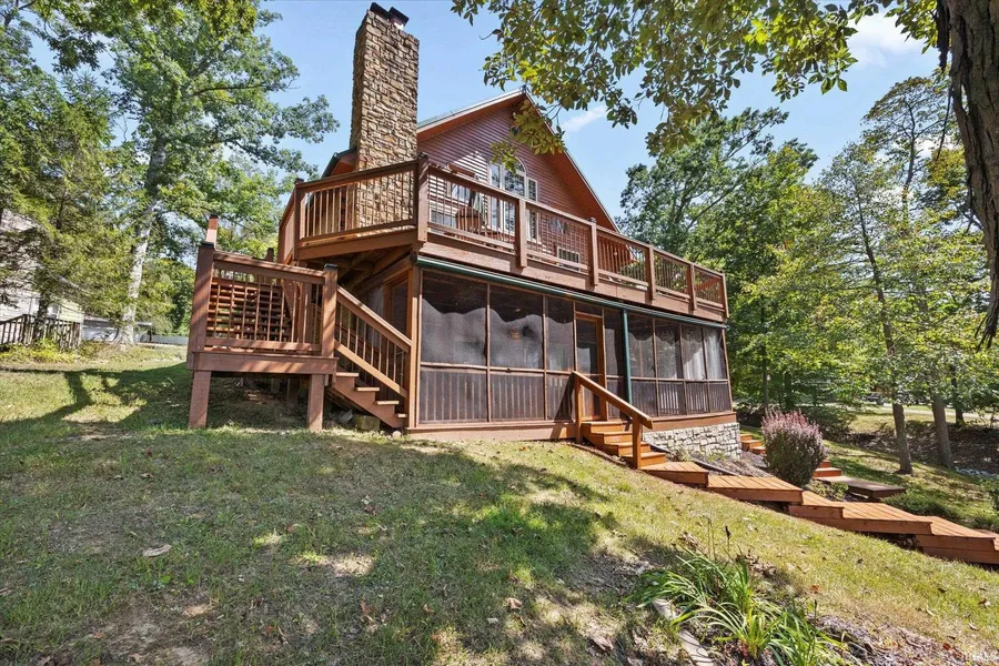 CAN SLEEP UP TO 10 PEOPLE...A SPECTACULAR LAKEFRONT RETREAT ON BEAUTIFUL LAKE LEMON Nestled in southern Indiana, just a short distance from Bloomington, this 2,312 sq. ft. lakefront home is the epitome of rustic charm and classic lakefront luxury. Situated on the scenic shores of Lake Lemon, this stunning property offers the perfect blend of entertainment and relaxation spaces, both indoors and out. Key Features: Private platform dock for fishing, kayaking, and boating Entertainment pavilion or storage building with a cozy wood-burning fireplace Sunbathing deck and large screened-in porch right by the water Multiple outdoor areas including an upper deck and a spacious lower screened porch with panoramic views of Lake Lemon Stone wall fire pit by the water, perfect for evening gatherings Expansive interior with ample room for a family retreat or permanent residence Wet bar on the lower level, ideal for hosting guests Gorgeous stained glass accents and vibrant natural light throughout, enhancing the home's lake lodge feel New covered hot tub by the lakeside for ultimate relaxation Whether you're looking to spend your days fishing, tubing, hiking, or simply soaking in the breathtaking lake views from the deck, this lakefront retreat offers something for everyone. It's a perfect sanctuary for both peaceful getaways and lively family gatherings.