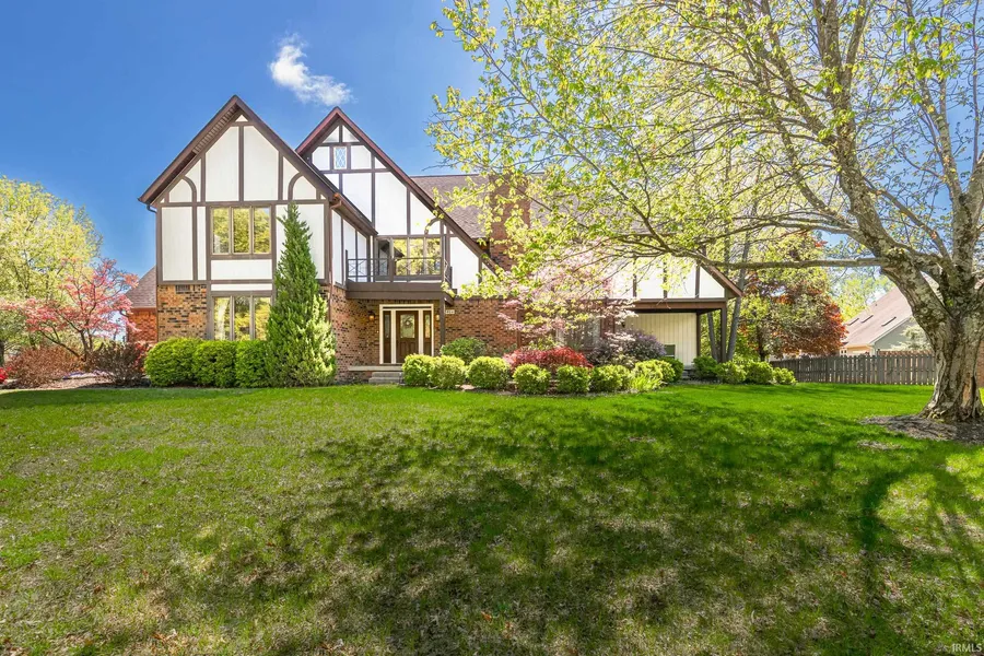 Versatile Tudor on a spacious lot. Greeted by a newly updated front porch and flanked with Brazilian Cherry hardwoods in the 2-story foyer. Vaulted ceilings carry over into the open family room which hosts one of three masonry fireplaces. This home boasts grand features with tasteful updates. Main level features include a formal living room with a second masonry fireplace, formal dining room with fresh paint, well appointed kitchen including new hardware, granite counters, new double ovens, island with cooktop, quality cabinets and a backsplash. The large family room features built in cabinets, water supply for a future wet bar, a fireplace with stone from floor to ceiling and access to the sun room. A mud room, full bathroom and versatile bedroom, currently used as a den round out the main level. Upper level hosts a stunning catwalk overlooking the foyer and family room, 4 spacious bedr...