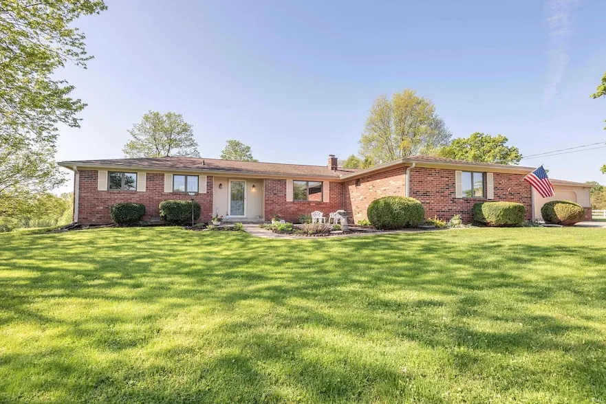 Remarkable opportunity to own over 18 acres of level ground within 15 minutes of Indiana University campus and IU hospital. The land itself lays beautifully and is adjoined by Griffy Lake Nature preserve. There are several possible build sites for additional homes or outbuildings if wanted, and acreage with pasture perfect to fence for horses. The home features a classic 1970s floor plan. For those wanting more of an open floor plan, the kitchen can be reconfigured and the wall between kitchen and living space could be opened up as it is non load bearing. It offers a split bedroom floor plan with a primary suite on one end and three bedrooms, one with a private half bath on the other end. The hallway and three bedrooms have hardwood under carpet. There is also a full bath for guests between the three bedrooms. The kitchen offers a lot of counterspace and is large enough for a small island if desired. There is a bar end for additional seating, open to dining and living room area. The great room offers two room configurations, one with a French door overlooking the land. There is a generous sized laundry area with cabinets and folding table. Outside you'll find a patio space and breezeway to enjoy the view. The home offers a 2 car garage attached by breezeway and a 30x40 pole barn building with electric and concrete floor. The possibilities are endless for those wanting a hobby farm, solar options, homestead activities, hunting or building a lake or pond for recreation. There is high speed internet available. It will exceed your expectations and is a must see!