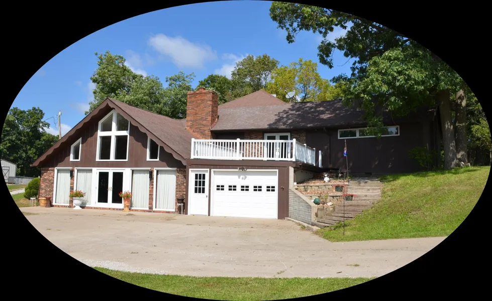 Attractive open concept country home on 7 acres. This home is split-level style with 3550 sq. ft. finished living space. Brick covered south entrance with to both living area and the one-car attached garage. Entering through the garage, one immediately moves to the convenient multi-purpose room which serves as laundry, utility, mud room and includes bath. Then on to the open kitchen that features huge breakfast bar with plenty of storage. The bright living room with tall vaulted ceilings features a wood burning fireplace with a tile hearth, large bright full-length windows, walk-out doors to the patio and exposed wooden beams. Four bedrooms with three including large master on second floor and one on main. Exciting spiral iron staircase to 2nd floor. 3 full baths with 2 on the upper level and 1 on the lower level. The home is designed for large family or entertainment fun. Finished 3rd floor attic den features wrap-around knotty pine and built-in gun case. Outside, lots of mature oak and other species trees offer enormous shaded lawn for your leisure and recreational enjoyment. Abundant whitetail deer and turkeys love it too! Wrap-around rock drive provides convenient parking and access to rear of home and small open-front storage shed. Large concrete parking area across south end of home.