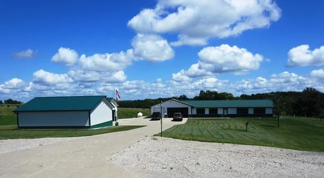 Southern Iowa, Monroe County, country home and acreage for sale on paved highway just minutes from Lake Rathbun. Luxurious 4 1/2 acres offers 2008 built, open-concept home and three-car garage. Home and garage feature gas-heated hot water floor heat in addition to forced air gas furnace. Anderson casement windows are used throughout. Two newer, attractive steel outbuildings, 30x30 and 32x32, complete with full concrete. Electric overhead doors offer plenty of storage options for your boat, 4 wheelers and recreational gear. Large concrete parking area and driveway provide an attractive and convenient entrance to this lovely home and afford plenty of clean & dry work space for all your projects. Manicured lawn wraps around the entire home and building site, insulating home from highway and offering great privacy. Numerous young trees are planted throughout the lawn. North of acreage is in hay; fenced scenic pasture surrounds acreage on two sides.