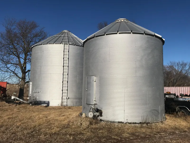 Other improvements on Tract 3 consist of a 54 X 100 X 16 Morton pole barn, perfect for machinery storage and livestock production. It is wired for 110 V. and 220 V. electric, it has a partial concrete floor in it, and in the southwest corner there is finished office space. There are also four functioning grain bins on Tract 3.