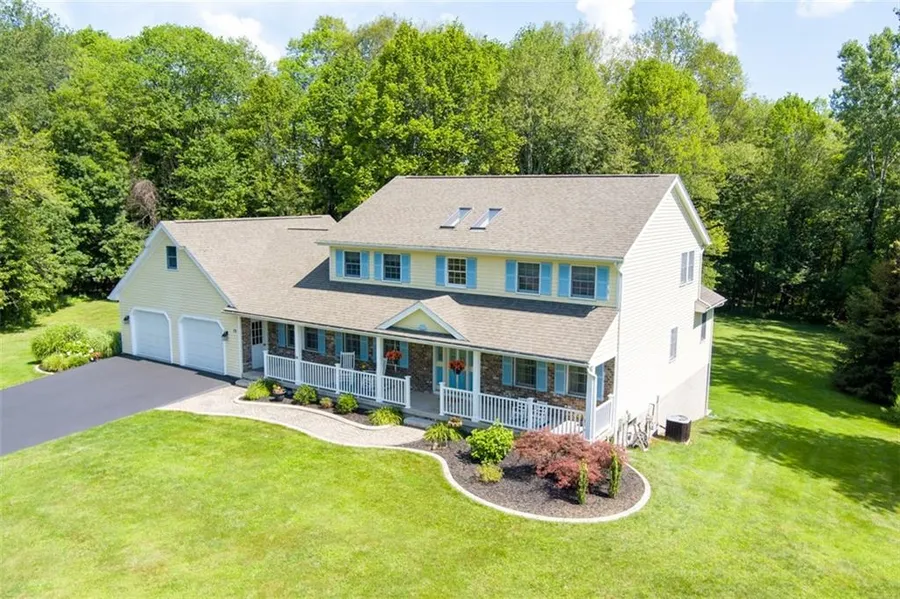 Awesome well maintained home with room to roam nestled on a quiet cul de sac. Home features a 2 story foyer with etched glass sidelights and front door. Living room and family room with glass french doors, formal dining accented with gleaming hardwood floors. Kitchen with room for a large table with a slider to the upper 12 x 29' deck. All appliances included. First floor laundry and a bedroom with closet or den. Lower level is a walkout with patio door and large windows not in the square footage. Additional 980 sq ft of living space. 2.5 car garage with another full garage below it, bonus room over main garage unfinished. Unbelievable storage or studio space. Hot water on demand 2021, roof 2009. Patio under the deck. All this nestled on 1.89 acres. Home is immaculate. Delayed negotiations till Aug. 10, 2021 at 5:00 p.m.