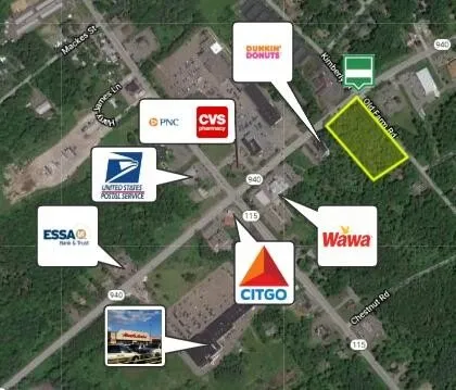 3.85 ac Commercial Development Site On State Route 940. The corner location at Old Farm Rd potentially allows for easier access and HOP approval. The site had plans for a 23,000+ SF proposed retail/office building. Some engineering has been completed. It is located just off the busy intersection of Route 940/115 in Blakeslee. It is adjacent to Dunkin Donuts and Dollar General. Central sewer is available.