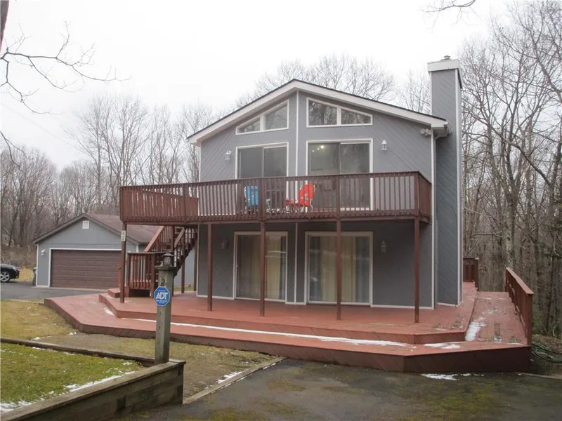 Private and Serene - Contemporary Situated on 1.39 Acres, which backs up to Mount Pocono Campgrounds. First Floor Family room with Wet Bar, Free standing Propane Stove, Office/Den area with sliding doors that lead out to an amazing Deck. First floor Bath and two Bedrooms one that leads to a private Deck. Second Floor Offer an Open Concept - Living Room with Gas Stone Fireplace / Dining Room and Kitchen, all leads to a Deck. Detached two car Garage with Paved Driveway w/lots of parking for all your entertaining parking needs. All this without an HOA.