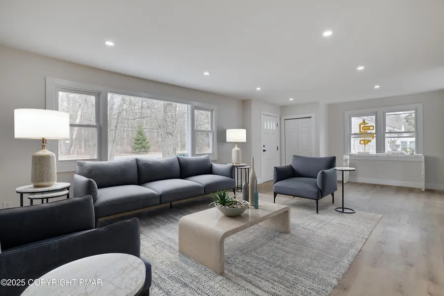 Welcome to this beautifully renovated 5-bedroom, 2-bath Ranch home on almost an acre of land in scenic Mount Pocono. With plenty of space both inside and out, this home is ideal for families who want comfort, convenience, and the beauty of the Pocono Mountains right at their doorstep. Step inside to a bright, open living room and a brand-new kitchen (2025) designed for family gatherings and meals together. Every detail has been updated, from the WINDOWS (2025) to the finishes, so you can move right in and start making memories. The fully finished lower level offers two bedrooms, High ceilings, recessed lighting, and its own heating-an ideal setup for a playroom, teen hangout, or even a cozy movie space & a WALK OUT Access! Out back, enjoy a spacious deck with mountain views and a yard big enough for a swing set, games, and outdoor fun. Whether it's weekend barbecues or relaxing evenings, this yard was made for family time. Located in the Pocono Mountain East School District, this home is also commuter-friendly, just 2 minutes to the Martz bus station and close to shopping, dining, lakes, trails, and year-round recreation. This home truly offers the best of both worlds-peaceful Pocono living with easy access to everything your family needs.