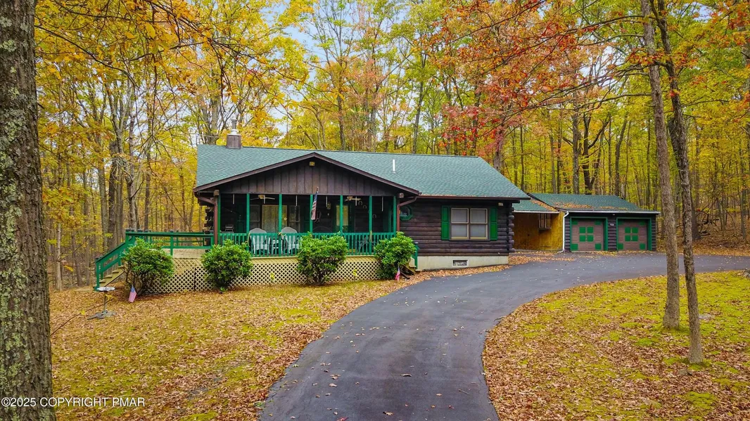 Being sold for the first time ever: This beautifully maintained 3-bedroom, 3-bath ranch-style log cabin in Pocono Heights has it all - a brand new roof on both the home and detached 2-car garage (May 2025), kitchen appliances are just 3 years old, and a 2-year-old furnace for peace of mind and efficiency. Set on over an acre of land in Middle Smithfield Township, this home perfectly balances modern updates with rustic charm. Inside, you're welcomed by hardwood floors, warm wood accents, and that unmistakable cabin feel that instantly makes you feel at home. The kitchen features granite countertops, new cabinets, and newer appliances. The wood stove in the living room keeps the home cozy while helping reduce heating costs, and can easily be converted to pellet or coal if preferred. The finished basement is ideal for entertaining, complete with a built-in bar, wet bar, fridge, and half bath. Laundry has been conveniently relocated to the first floor, though hookups remain in the basement as well if preferred. Additional highlights include a low HOA, and access to community amenities like the clubhouse and lake access. The septic was recently pumped in June 2025, and with major systems recently updated, this home is truly move-in ready and sold as-is. Ask how to receive a $2,000 lender credit towards closing costs or lowering your interest rate!