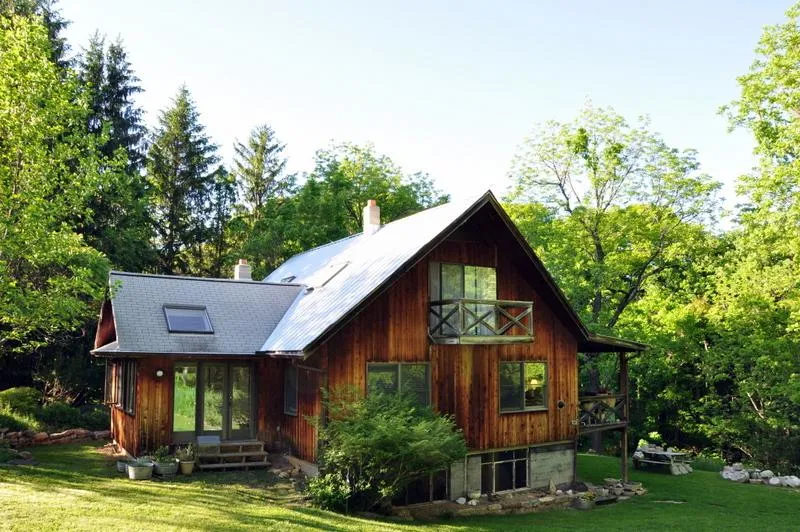 The delightful 2600+/- square foot cabin was custom designed and constructed to create a home that values natural light, comfort, livability, efficiency, warmth and coziness. This warm and inviting home meets the needs of daily living and designed to flood the interior with natural light throughout the seasons. One is surrounded by beautiful forms, special details and natural materials. The atrium is terrific for growing flowers and plants in all seasons. The two porches create an extra dimension and add to the quality of living, as does the outdoor Koi pond, special rock garden and the more formal garden.
