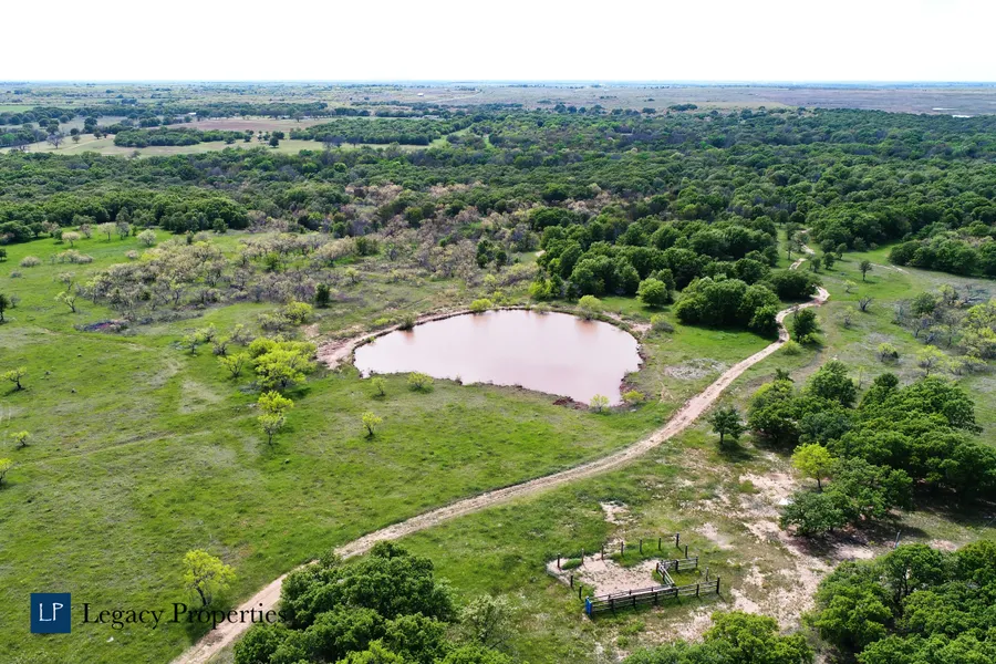 From the entrance on the west side to the creek bottom, the topography changes by 90 ft. (890' to 810') Approximately 5 acres of pasture around the entrance has been grubbed and cleared; the balance of the property is tall trees, including post oak, elm, pecan, bodark and some mesquite. As you enter the property, the road winds you past a grove of oaks with views that take you across the fishing pond to the creek valley. Electricity and a water well are in place here too, making for the perfect home building site. The well is 200 ft. deep and has 60 ft. of water in it. It produces 18 gallons per minute using a 1.5 hp pump.