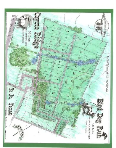 MLS# 11717708. This is nicely developed 97 acre property fully surveyed as a housing development. The plat has been approved by the Saint Jo City Council. The development consists of 40 lots called Bird Dog Run with each lot from measuring 9,000 sq ft to 15,400 sq ft. and 36 lots named Coyote Ridge with each lot measuring from 1.4 acres to 4.6 acres. The city has indicated they will provide city services in the event a developer provides a comprehensive development plan.