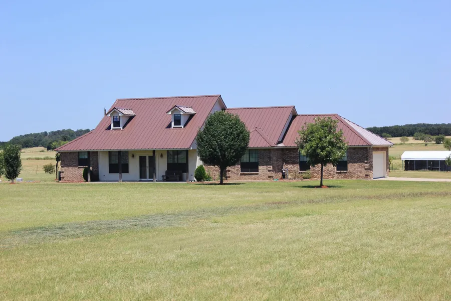 This house is approximately 1,896 sq ft. (per the tax appraisal district) It was built in 2005 and has a brick exterior and metal roof, with an attached two-car garage. It uses public electricity and the local community water system, and has a three tank septic system. The home has three bedrooms and two full bathrooms, a separate dining room, large living room with fireplace, enclosed sun room, and additional space upstairs in the attic that could be converted into another bedroom or used for storage. The whole house has tiled floors and custom trim throughout it. Th...
