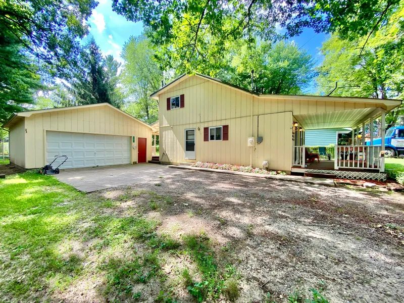 Cute cottage or primary residence with Lake Access to Bass Lake within walking distance. It has 2 lake access options!!! One Private Association access point (a tenth of a mile away) and one public access point, Bass Lake Park (about a quarter mile away). Main floor master and laundry for easy living. Enjoy a beautiful view of the pond across the street on the nice covered porch or relax on the large back deck that is also covered. The garage has 220 amp service and floor drain. One full bath on each floor, Vinyl replacement windows, newer carpeting and linoleum, just waiting for your personal touches! You wont want to miss this one!