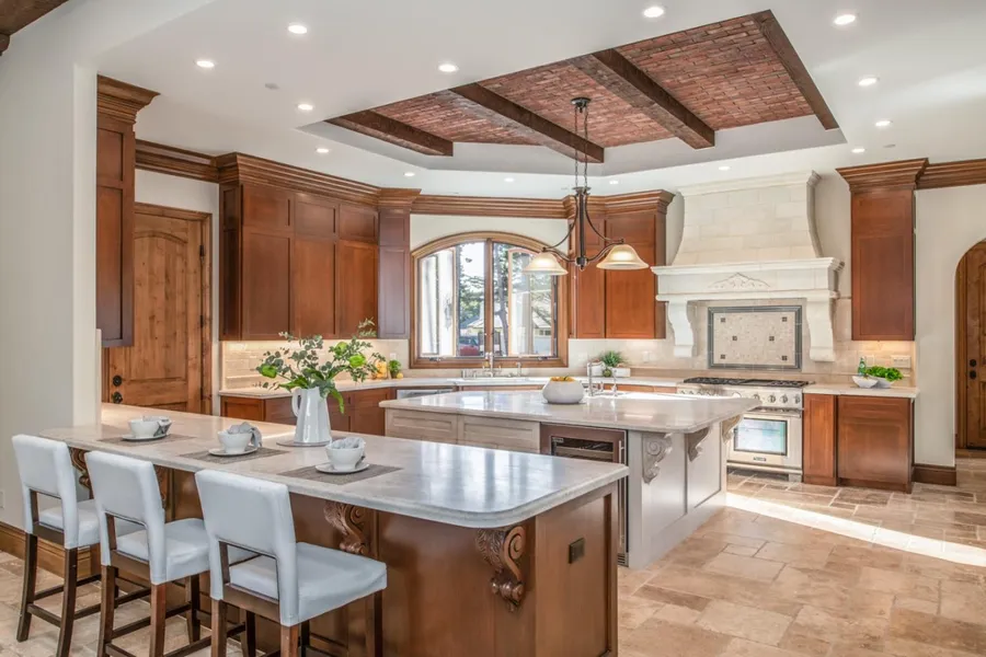 Rich in the tradition of the Old-World era, this new Mediterranean-style home on 1 acre makes an impressive statement of luxury and design. Sited on the 13th fairway of Poppy Hills Golf Course, this spacious 5228 sf, single level home blends past and present with rich textures and architectural details. With delightful arched windows and entryways, beamed ceilings, and alder wood cabinetry, stone floors, French doors, and 12' ceilings, this pristine 5-bedroom and 5.5-bathroom home with 2 separate attached garages also features an alder wood library with a labyrinth ceiling and French doors opening to a tiled courtyard with decorative wrought iron. The chef's kitchen merges tumbled marble and granite with custom cabinetry and stainless steel appliances. The backyard covered loggia with travertine patio and steps provide a serene outdoor living space to relax and enjoy the beautiful golf course landscape. Less than a mile from Pebble Beach Lodge.