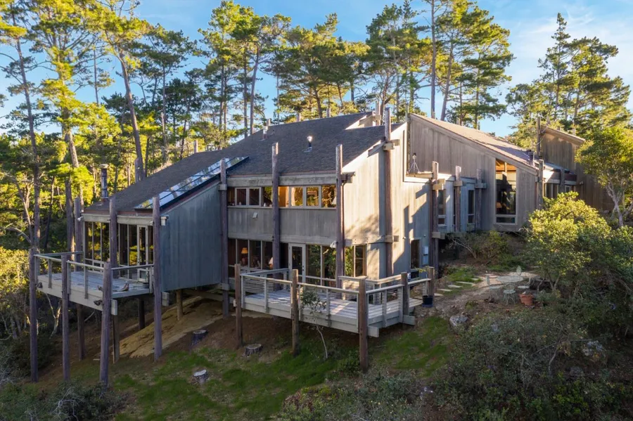 On a quiet street just up the road from the Pebble Beach resort behind a private gated entrance lies this striking architectural home with multiple indoor-outdoor living areas to breathe in the serene forest atmosphere. Passing through the lush front archway you will enter into a grand living room with soaring vaulted ceilings and ocean views that extend throughout much of the house. Plentiful windows and skylights contribute abundant natural light and the surrounding Del Monte Forest provides privacy and filtered golden sunshine during the day. The spacious master suite includes a walk-in closet, soaking tub, and a large balcony to enjoy sunsets each evening. Although the property is just a short drive from shopping, restaurants, and the Beach & Tennis Club, it provides a sense of serenity usually found in the likes of Big Sur. Welcome home to your very own Pebble Beach Haven.