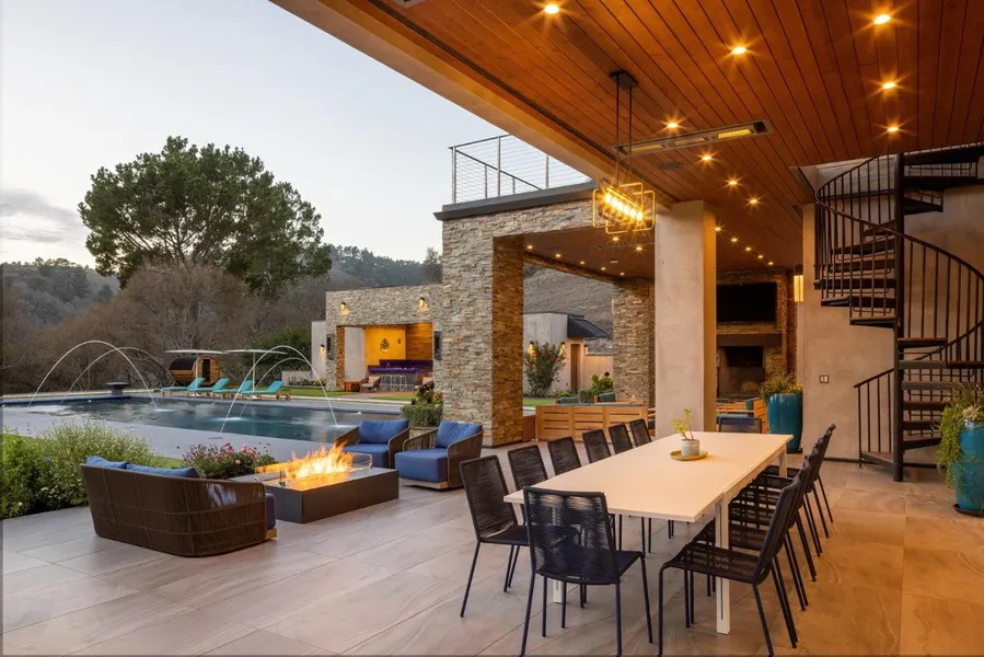 Located amongst the rolling hillsides of world-renowned Tehama Golf Club, this turnkey, 6-acre, gated estate features stunning contemporary design and an impressive list of amenities. The expansive stone-paved motor court connects the impressive main house and spacious 2-bedroom guest house with an alluring fountain decorating the center. The open floor plan flows effortlessly through the grand foyer into the living room, dining room, kitchen, and through to the backyard and pool areas. The gourmet kitchen features an illuminated Onyx countertop and a large butler's pantry. Other highlights include an outdoor kitchen equipped with a barbeque and custom-built pizza oven, sauna, and an oversized heated pool with fountains, fire pits, and colorful lighting and a combined 9-plus car garage space. The upper deck overlooks the pool area and enjoys picturesque views of the Santa Lucia mountains. The estate offers a stunning and private setting with almost 10,000 square feet of living space.